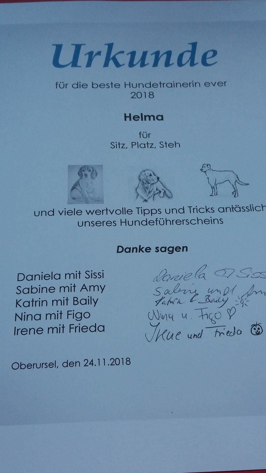 Ich gratuliere ganz herzlich den Mensch/Hund Teams für Ihre super Leistung. Theorie mit Null Fehler und die Praxis kompetent gemeistert.